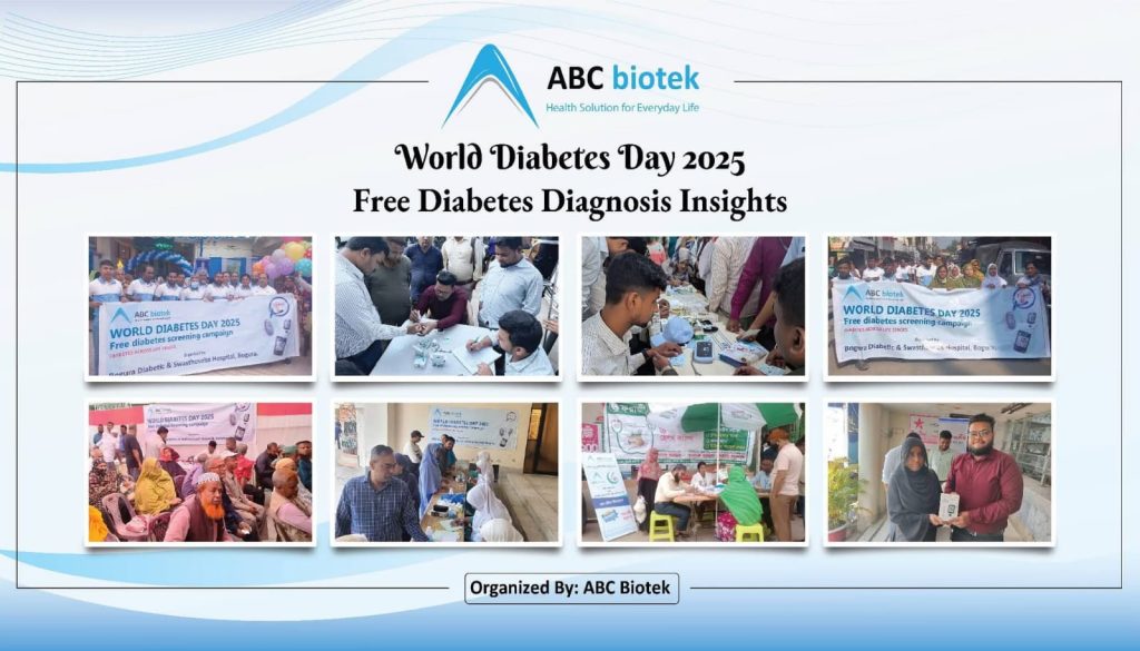 এবিসি বায়োটেকের পক্ষ থেকে জানানো হয়, গত ১৪ নভেম্বর ২০২৫, সকাল ৯টা থেকে বিকেল ৫টা পর্যন্ত, ঢাকাসহ সারাদেশের বিভিন্ন গুরুত্বপূর্ণ এলাকায় বিশেষ বুথ স্থাপন করা হয়। সেখানে অভিজ্ঞ ডাক্তার, মেডিকেল টেকনোলজিস্ট ও স্বাস্থ্যকর্মীরা উপস্থিত থেকে অংশগ্রহণকারীদের বিনামূল্যে রক্তে গ্লুকোজ পরীক্ষা, ফলাফল বিশ্লেষণ এবং প্রয়োজনীয় স্বাস্থ্য–পরামর্শ প্রদান করা হয় এবং দেশের ২০টি জেলায় প্রায় ২০,০০০ মানুষ এই সেবার আওতায় ডায়াবেটিস পরীক্ষা করেন। একইসাথে Advanced ABC Group -এর ৫২টি শাখা থেকে অতিরিক্ত সেবা দেয়া হয় আরও ৩০,০০০+ ব্যক্তির।